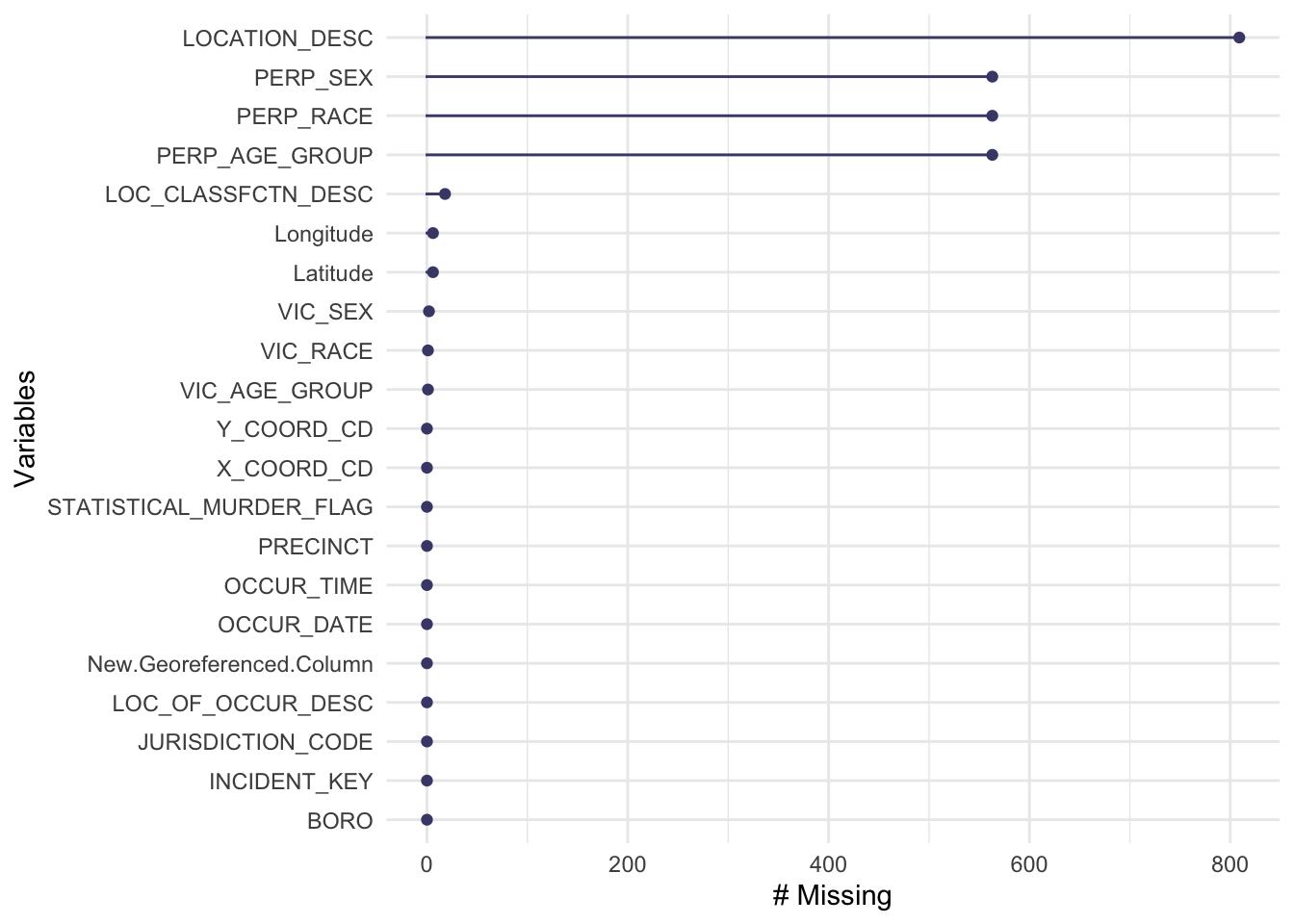Also notice that 4 out of the 7 missing columns are about the location of the incident, the other 3 columns are all about the information of the perpetrator, and the pattern (p_age, p_sex, p_race) ranks the third for the percentage of rows. This shows that sometimes the perpetrator is able to escape from the crime scene, leaving with no record to the police, which is a strong contrast to the victims’ data since no victim’s information is missing in this data set.